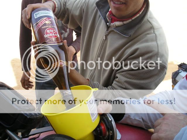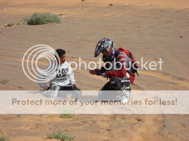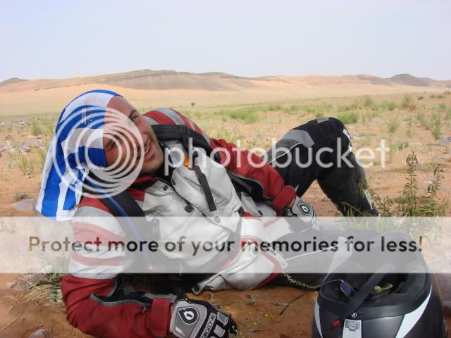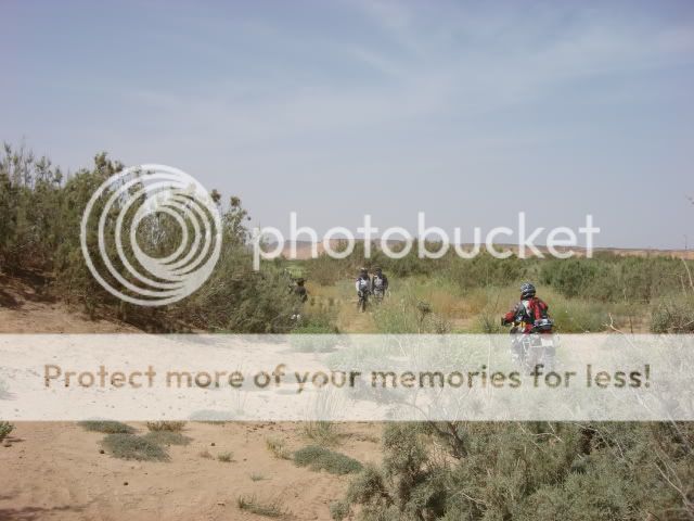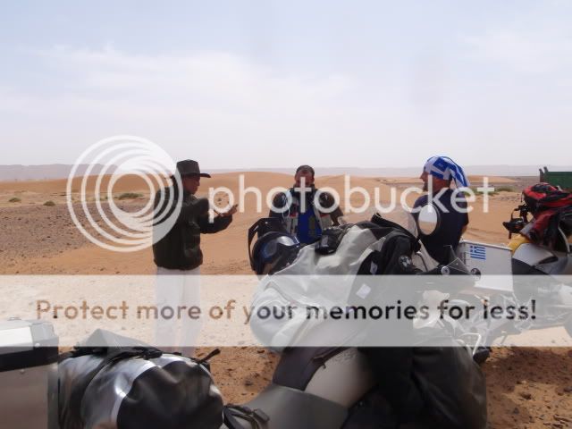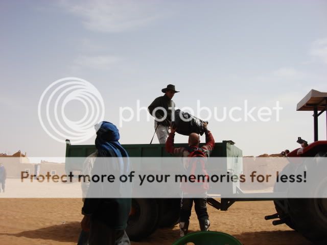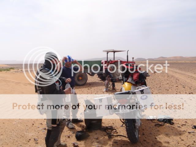 Μόνο τη δεύτερη μέρα στο χώμα είχαμε βοήθεια, για να περάσουμε το ποτάμι και τους διπλανούς αμμόλοφους. Ο Γιούσεφ, ο οδηγός μας, δε πήρε χρήματα για να μας οδηγήσει γιατί το έκανε σαν χάρη στον αδελφό του. Επιπλέον μας είχε ζητήσει μια ελληνική σημαία και χάρηκε πολύ που τον θυμηθήκαμε και του την πήγαμε. Ο οδηγός του τρακτέρ πήρε 40ευρώ για να μας μεταφέρει τα πράγματα μας και για παρέα ήρθε με έναν φίλο του και έναν πιτσιρικά. Μας περίμενε στην κοίτη του ποταμού οπου έβαλαν ένα χεράκι και μετά τον βρήκαμε στο τέλος των αμμόλοφων οπού εκεί - εκτός από το έδαφος, είχαμε φτάσει και εμείς στα όρια μας - έβαλαν και τα δυο χέρια  ;D  ;D  για να βγούμε σε στέρεο έδαφος.....